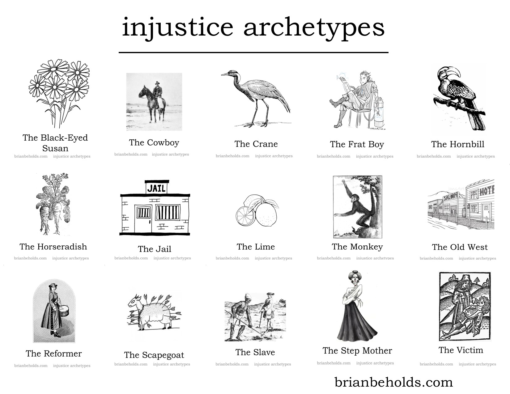 Injustice Archetypes: black-eyed susan, cowboy, crane, frat boy, hornbill, horseradish, jail, lime, monkey, old west, reformer, scapegoat, slave, step mother, victim