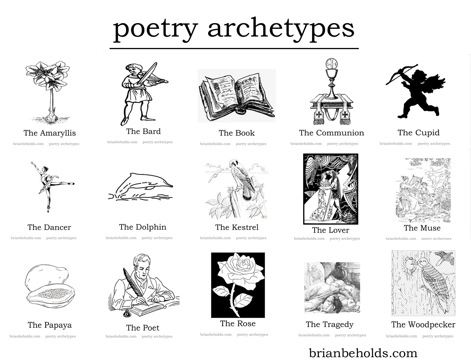 Poetry Archetypes: amaryllis, bard, book, communion, cupid, dancer, dolphin, kestrel, lover, muse, papaya, poet, rose, tragedy, woodpecker