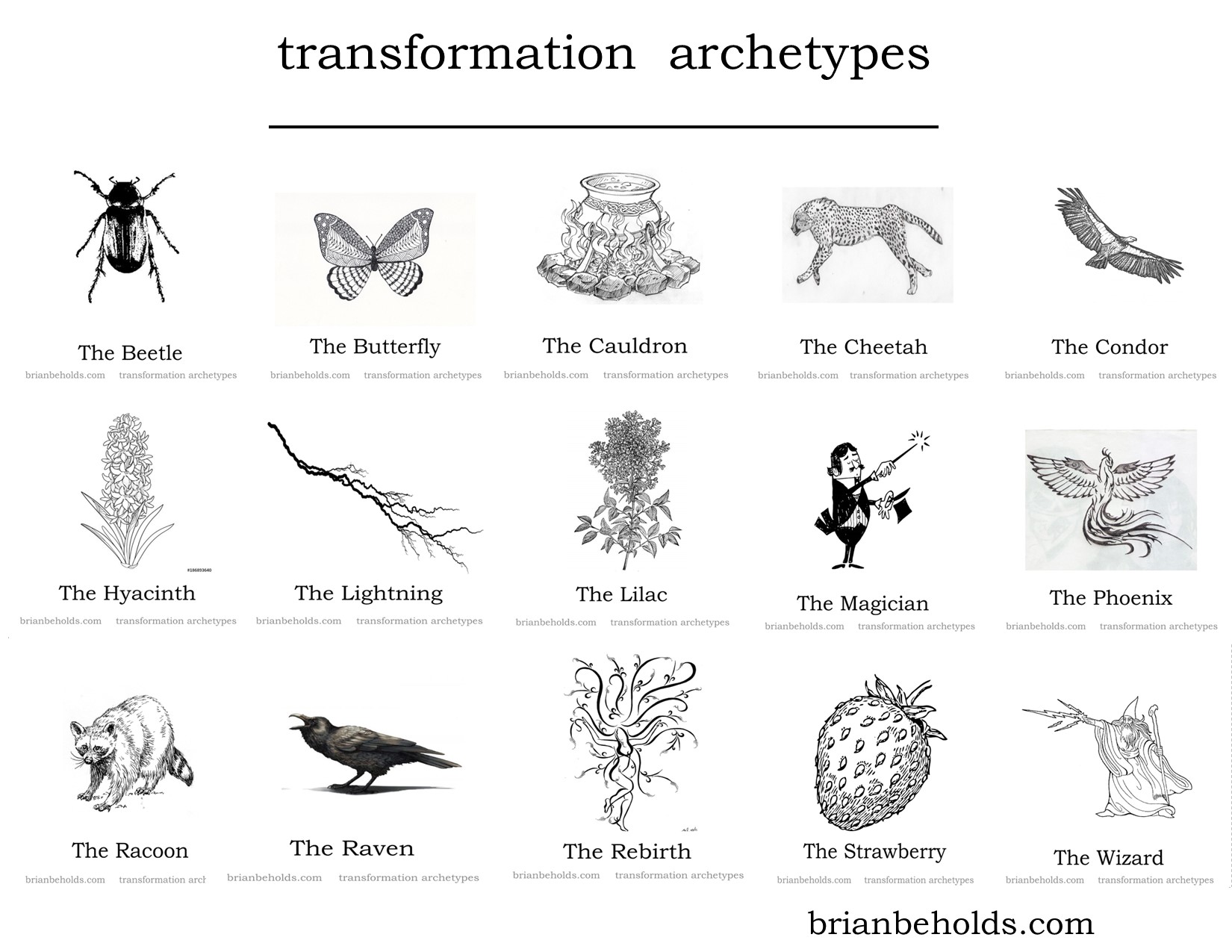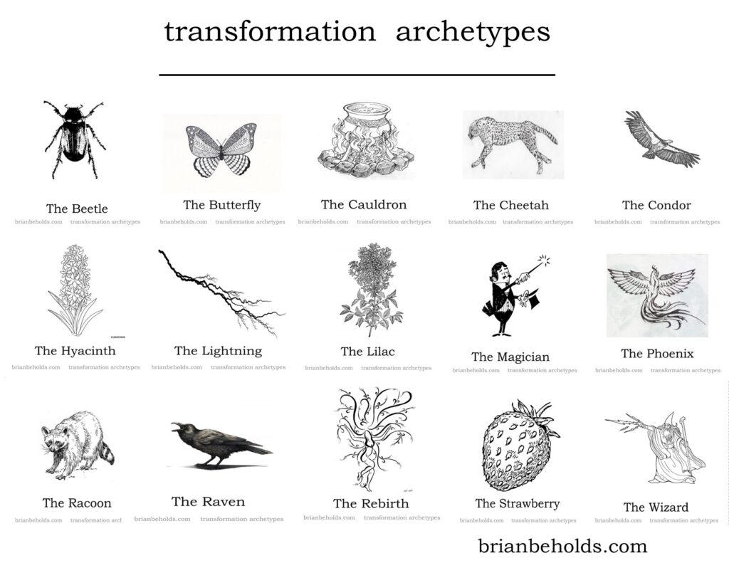 Archetypes: beetle, butterfly, cauldron, cheetah, condor, hyacinth, lightning, lilac, magician, phoenix, racoon, raven, rebirth, strawberry, wizard